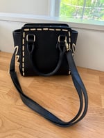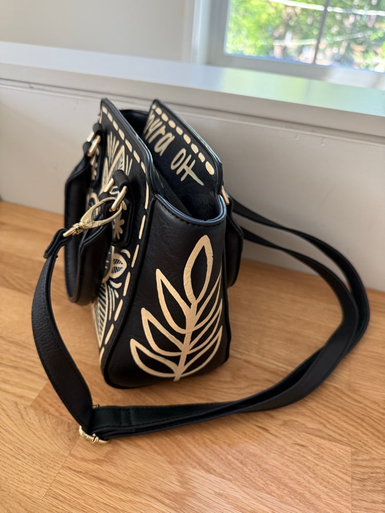 This thrifted bag has been hand painted with enamel